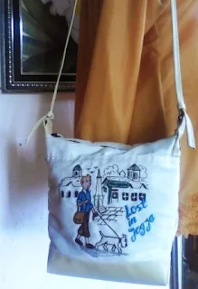 Tas kanvas dengan hiasan bordir tema kartun Tintin Lost in Jogja. Tas selempang kecil yang praktis untuk dibawa jalan-jalan santai, sekedar mengantongi dompet dan hape. Panjang tali bisa diatur panjang-pendeknya. Lukisan bordir dibuat menggunakan mesin Juki. Penutup memakai ritsliting. Ukuran tas; panjang 24cm, tinggi 28cm, dan lebar 9cm. Harga: 100K IDR (tidak termasuk ongkos kirim).